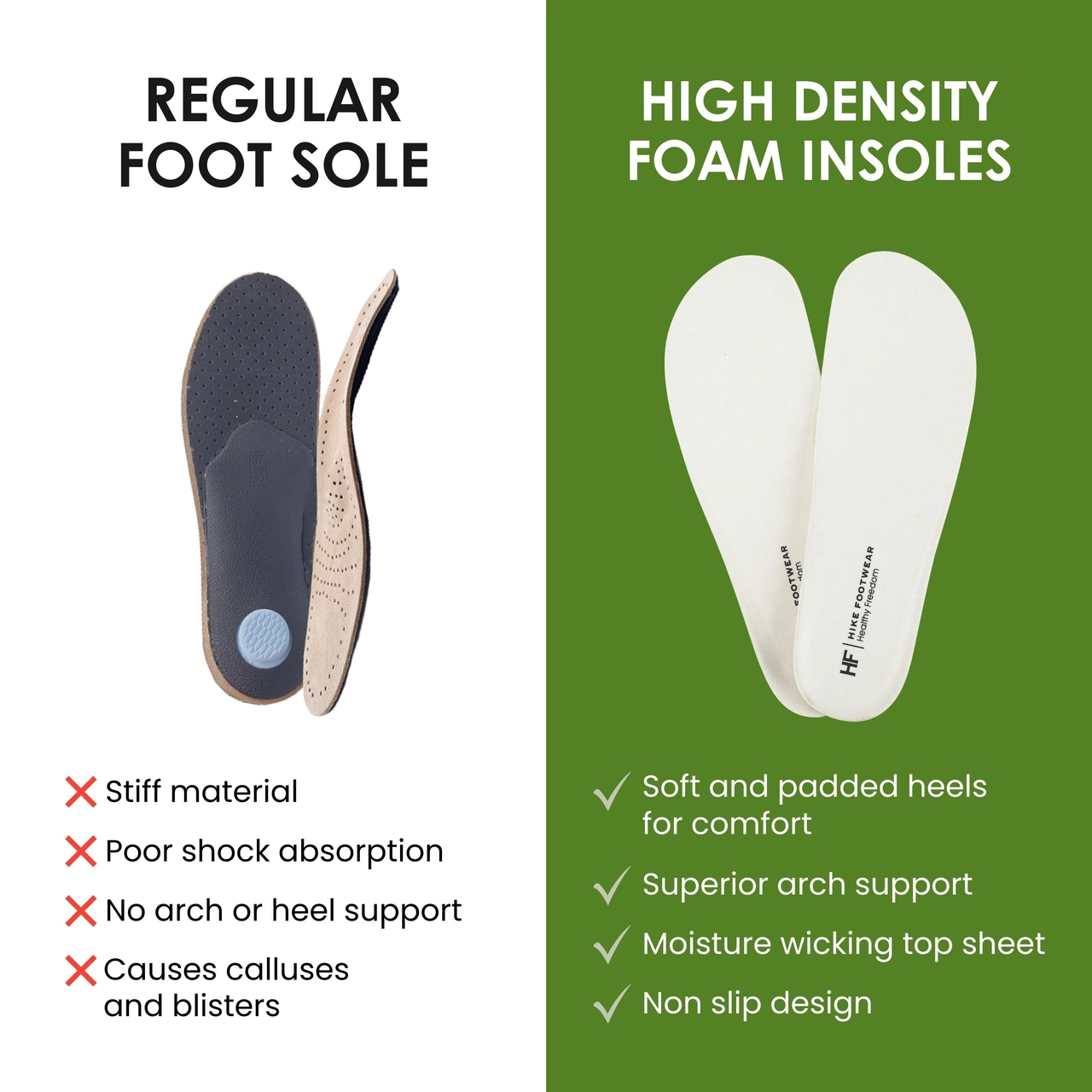 Herkömmliche Einlegesohlen nutzen sich schnell ab und verlieren bereits nach wenigen Malen Tragen ihre Stützkraft. UnsereEinlegesohlen aus hochdichtem SchaumstoffSie sind so konstruiert, dass sie auch bei täglichem Gebrauch ihre Form und Dämpfung beibehalten. Das bedeutet Beständigkeit.Komfort und Langlebigkeitdie wesentlich länger halten als herkömmliche Einlegesohlen.